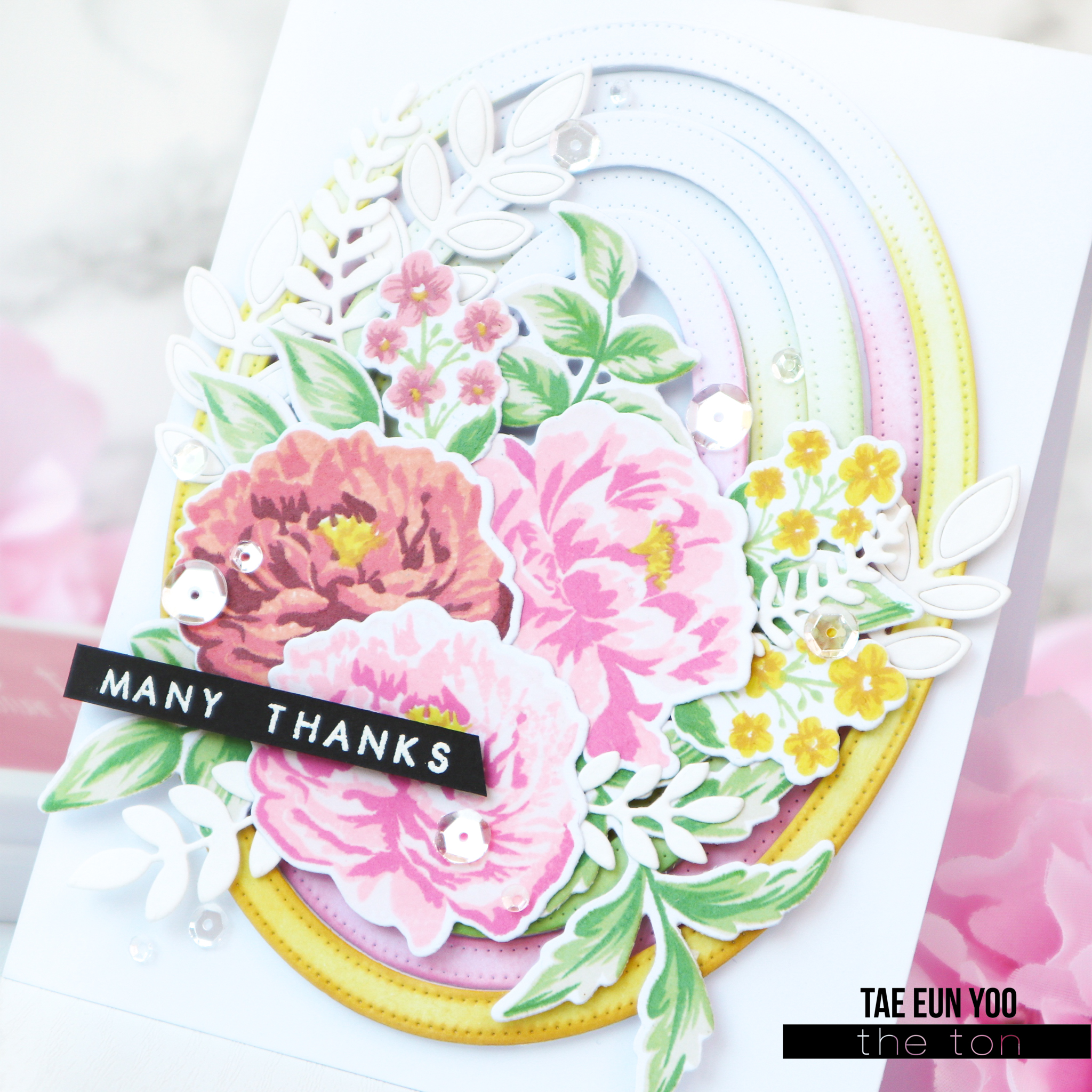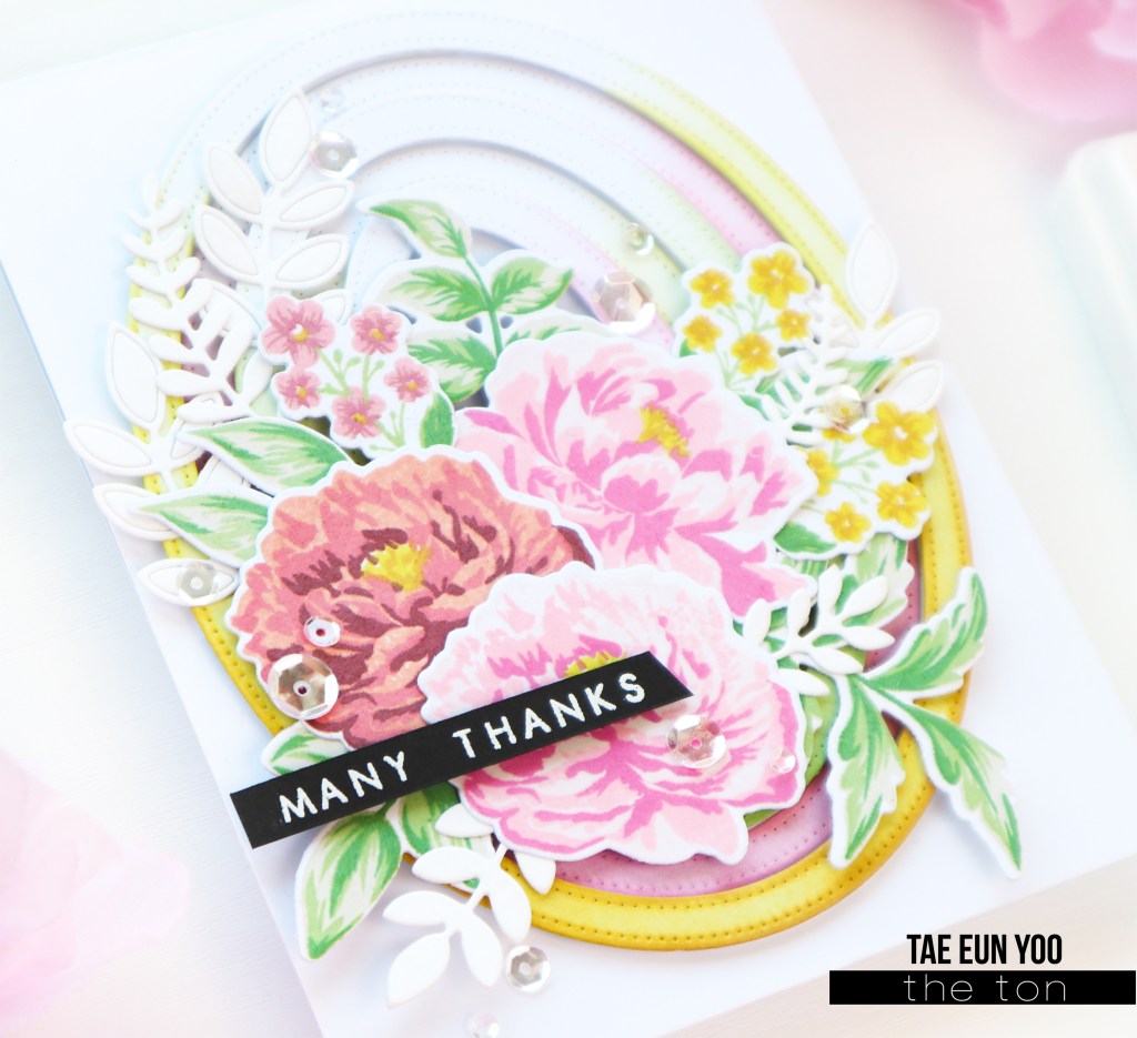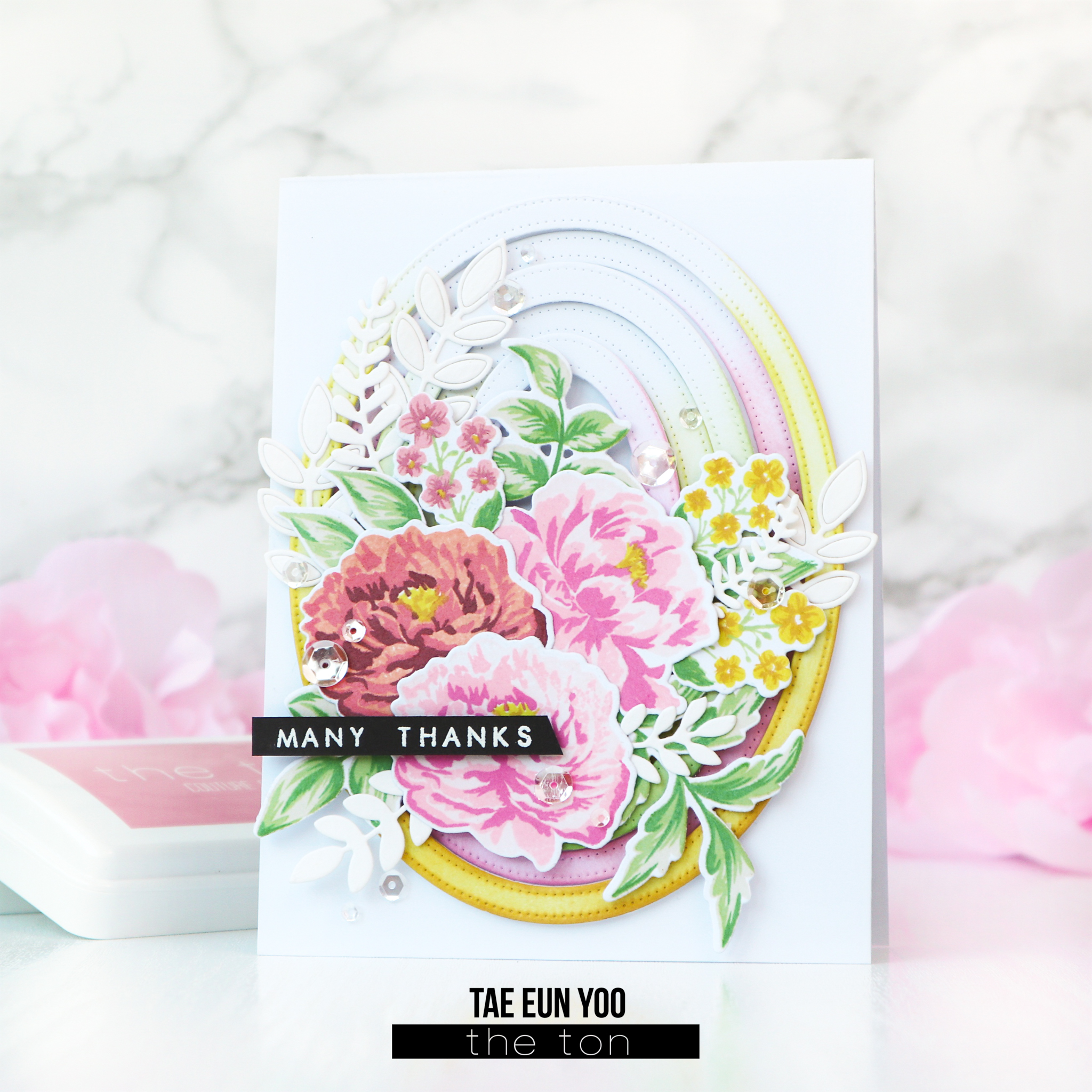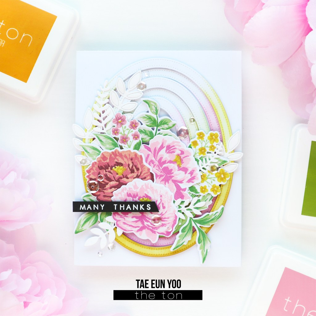 Hello crafty friends! Hope you’re all doing well! It’s TaeEun here today with a floral Thank You card featuring one of our new Grouped Layering stamp sets, Vivid Peonies. I added a few small flowers from Blossom Branches set and leaves from Bountiful Leaves set to my bouquet!