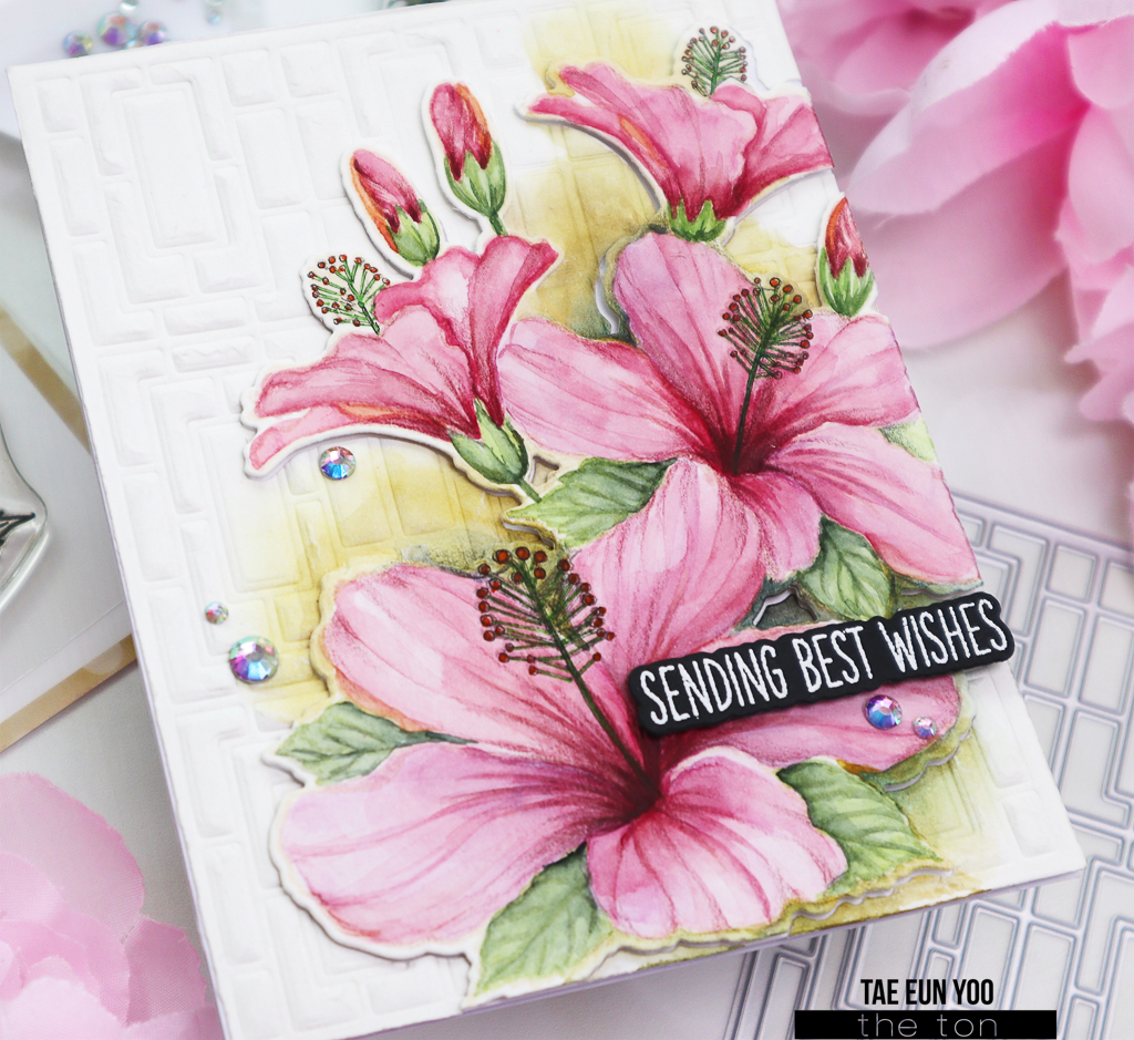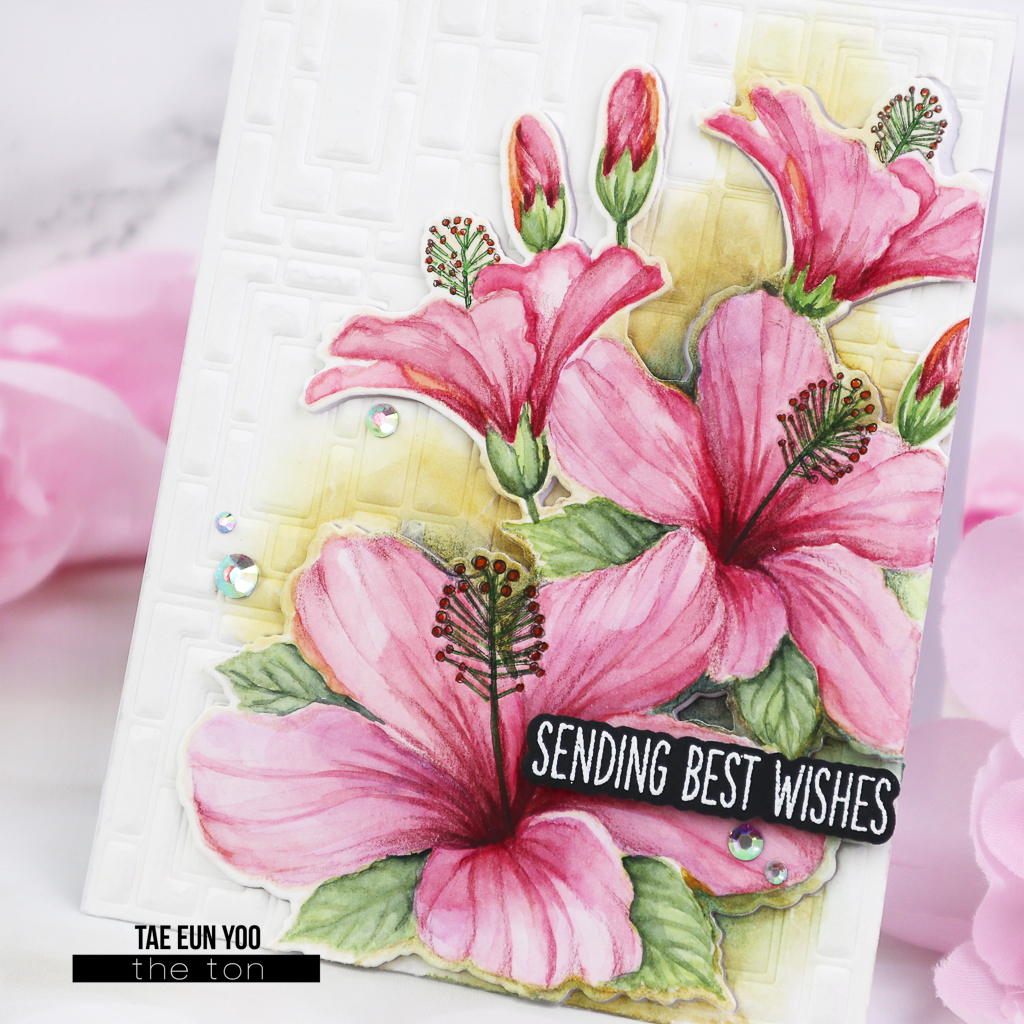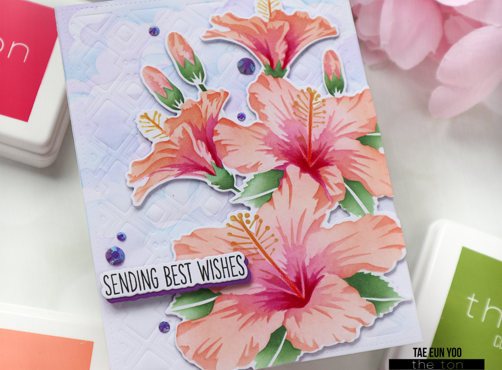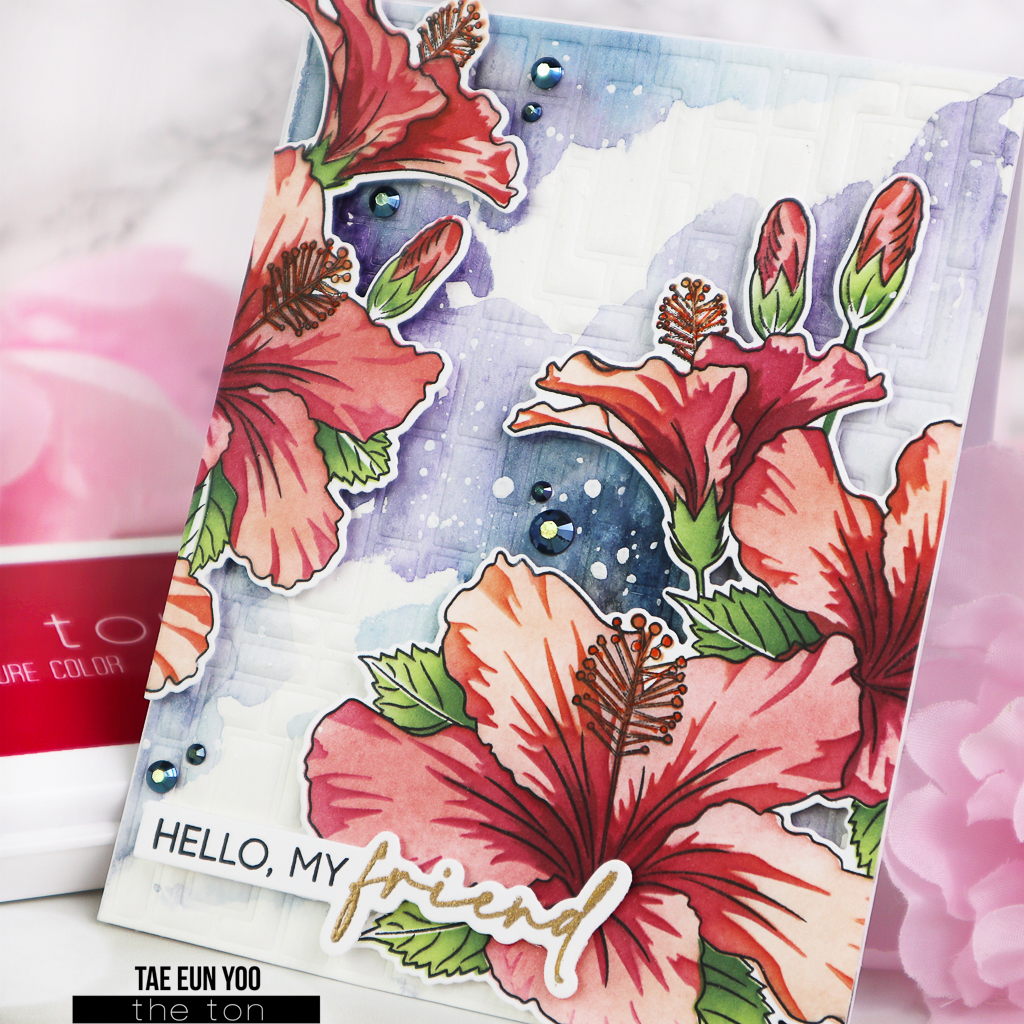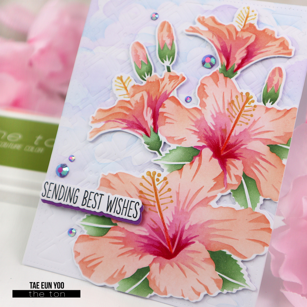 Hello, everyone! Hope you’re having a lovely weekend! It’s TaeEun here today with a stenciled hibiscus card. I used the Climbing Hibiscus layering stencils to create my card. There is a coordinating outline stamp called Coming Up Hibiscus. However, I didn’t use it to give my card a no-line coloring look. You can achieve this easily using the layering stencils !