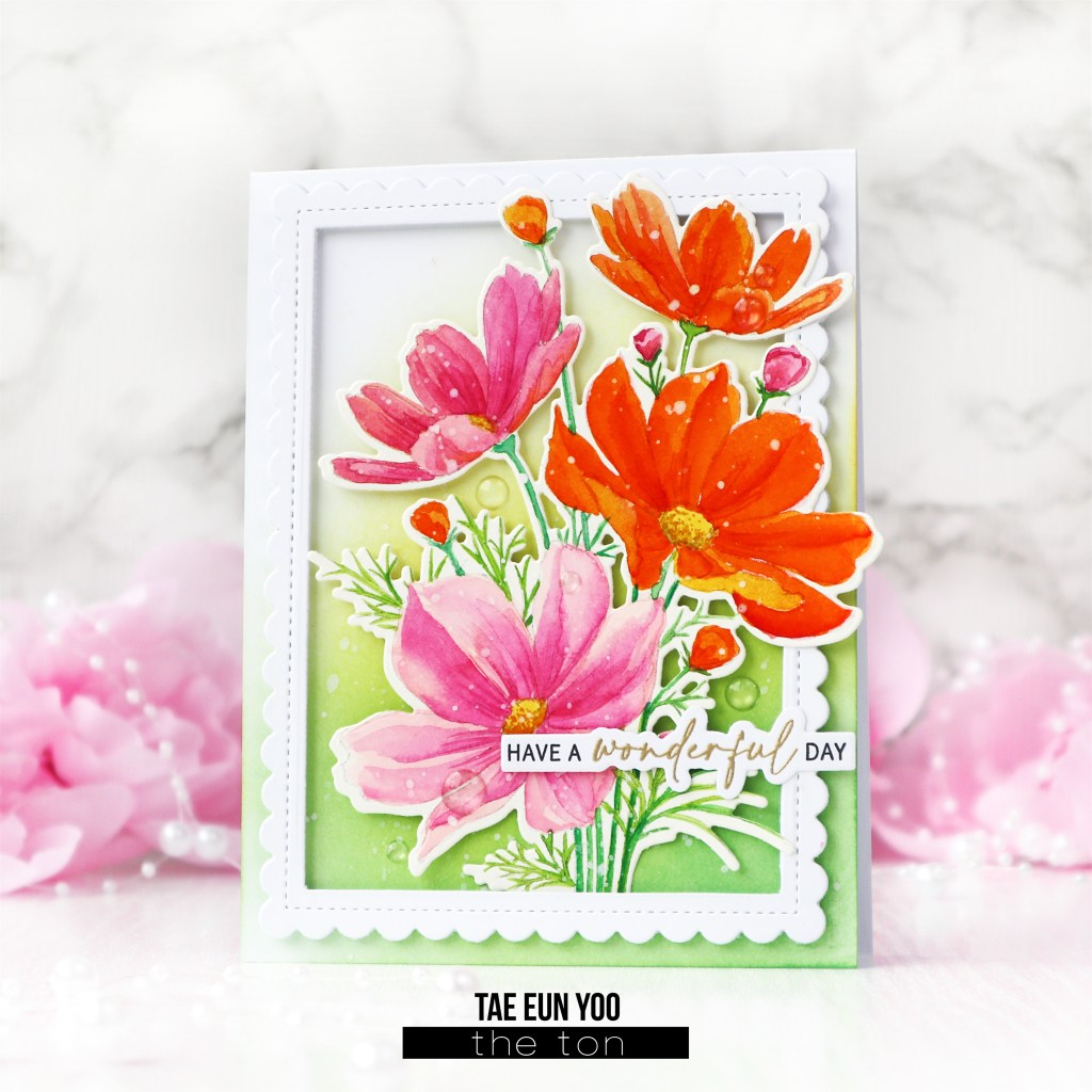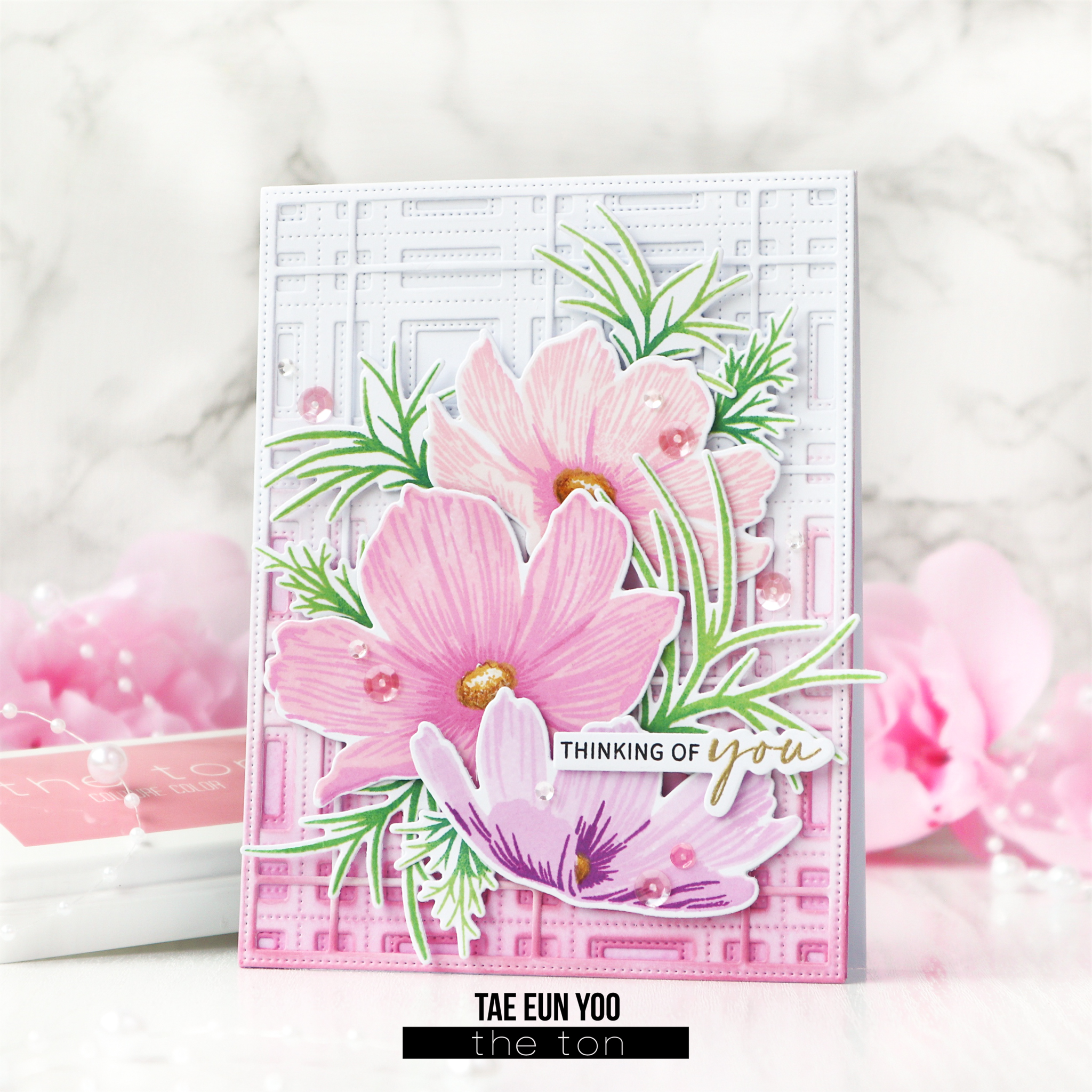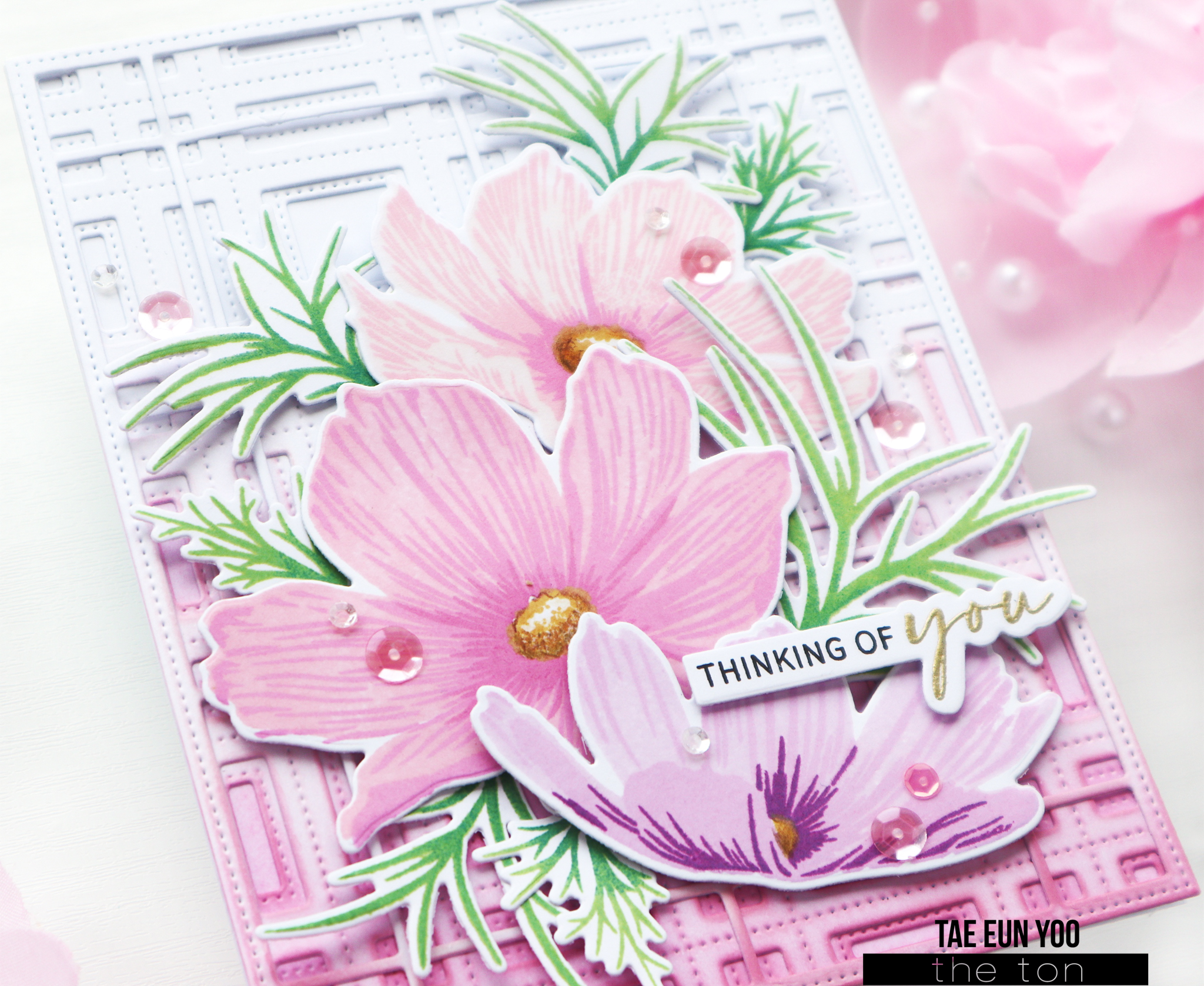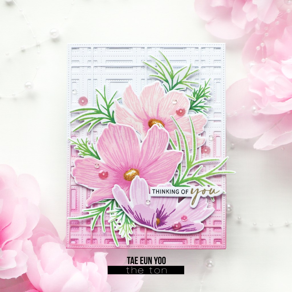 Hello and Happy Friday, everyone! It’s TaeEun here today sharing a slimline card featuring Climbing Cosmos Layering Stencil set from the latest release. This layering stencil set coordinates with the Coming Up Cosmos stamp and die sets. I combined the flowers with the Slimline Fractured die cut background.