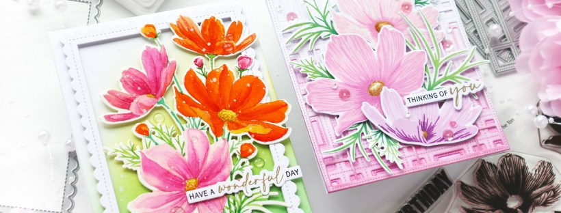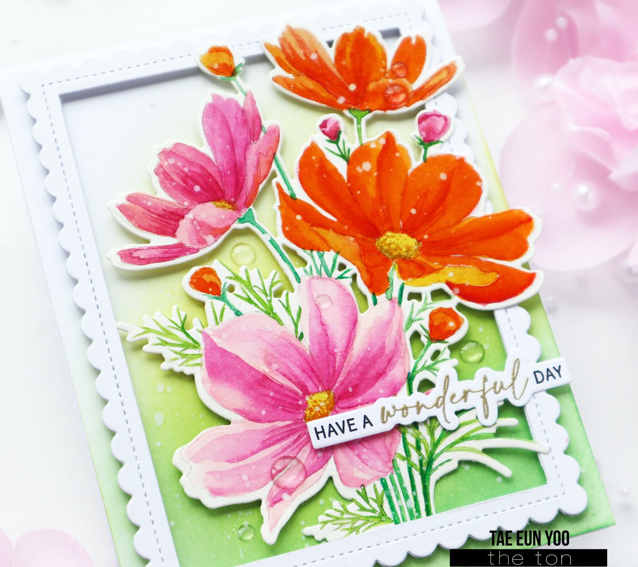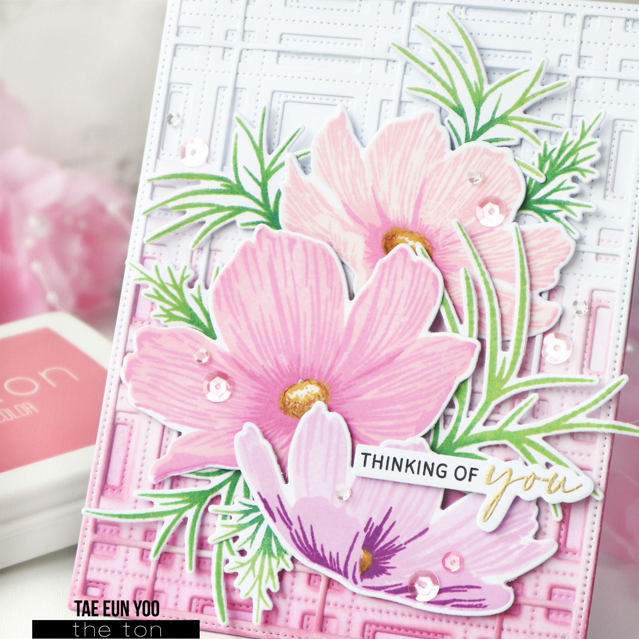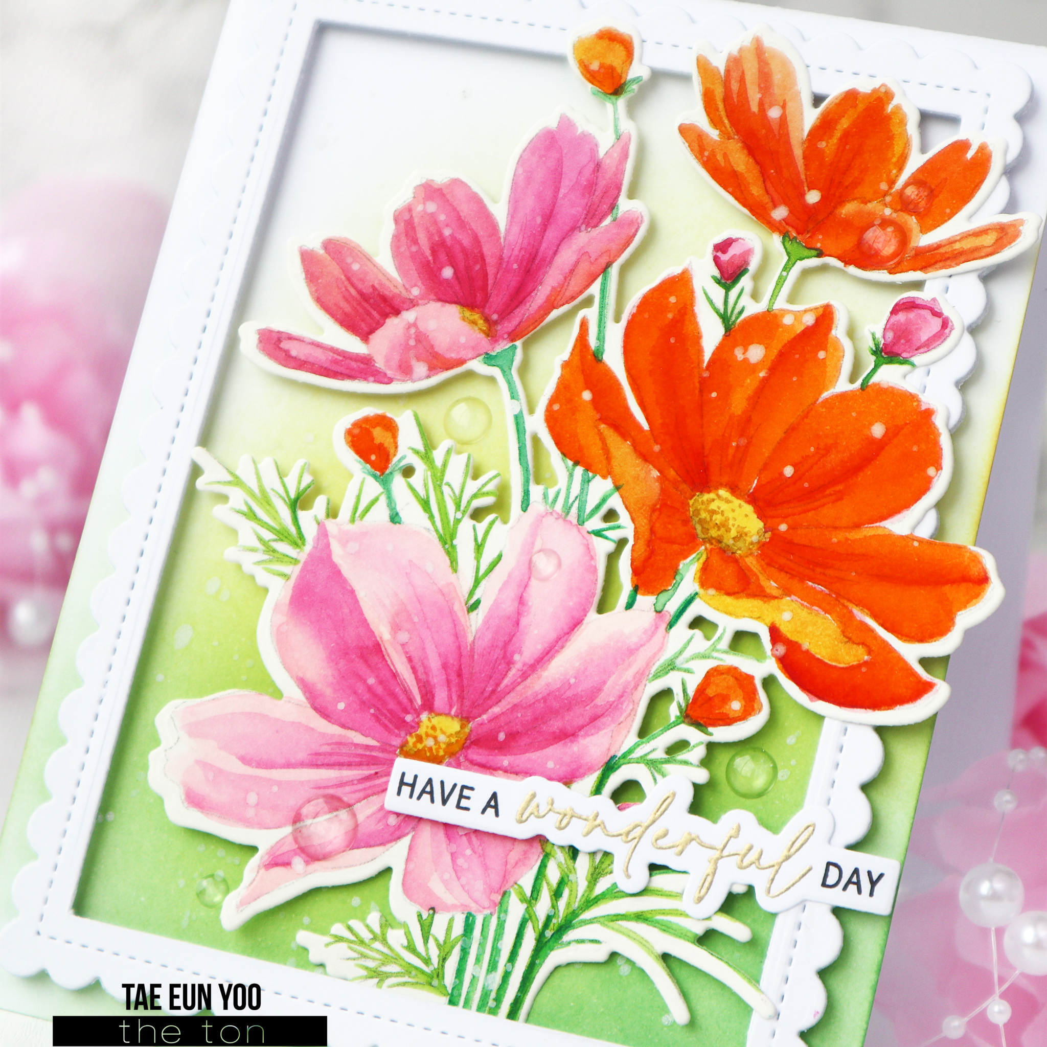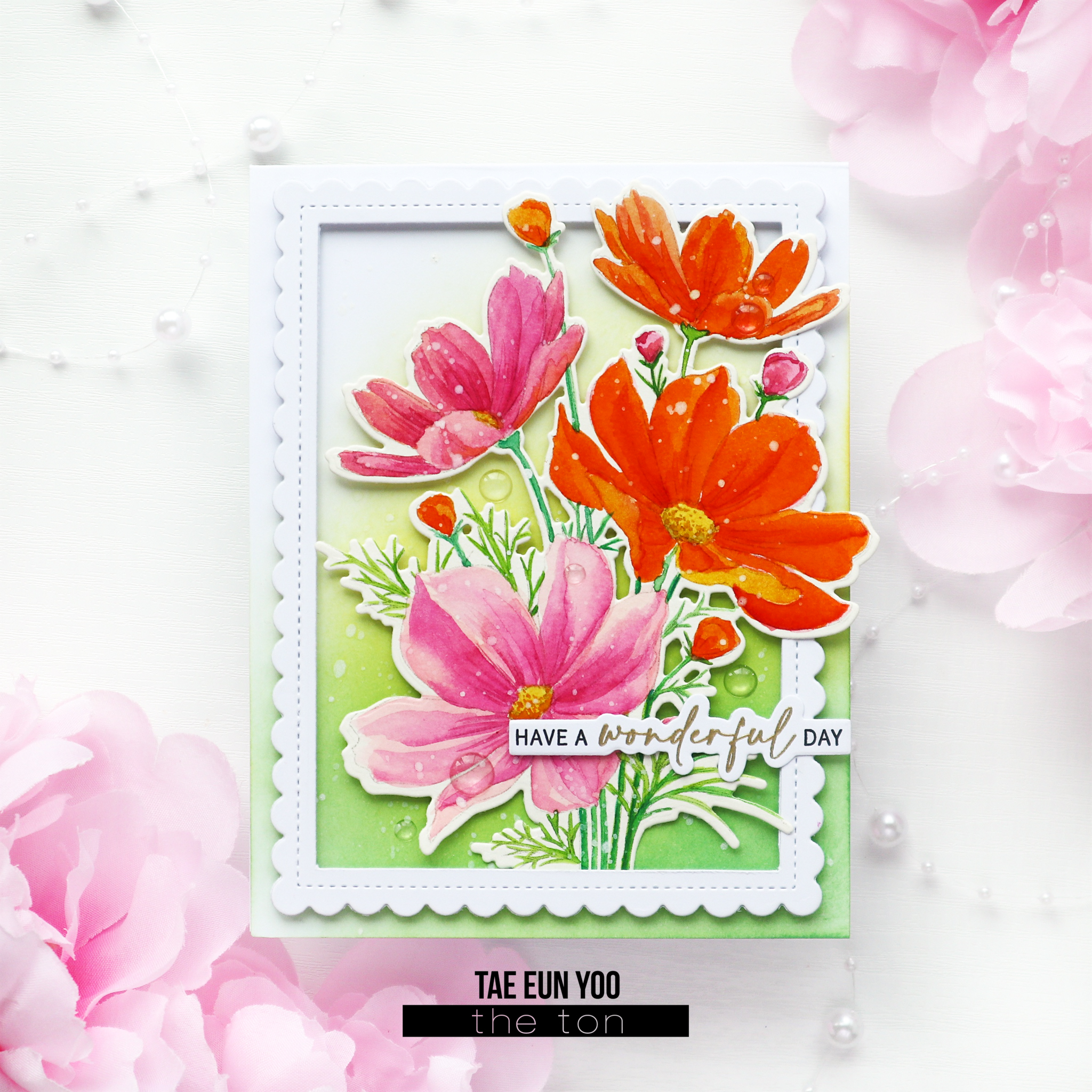 Hello and Happy Friday, everyone! It’s TaeEun here today sharing a slimline card featuring Climbing Cosmos Layering Stencil set from the latest release. This layering stencil set coordinates with the Coming Up Cosmos stamp and die sets. I combined the flowers with the Slimline Fractured die cut background.