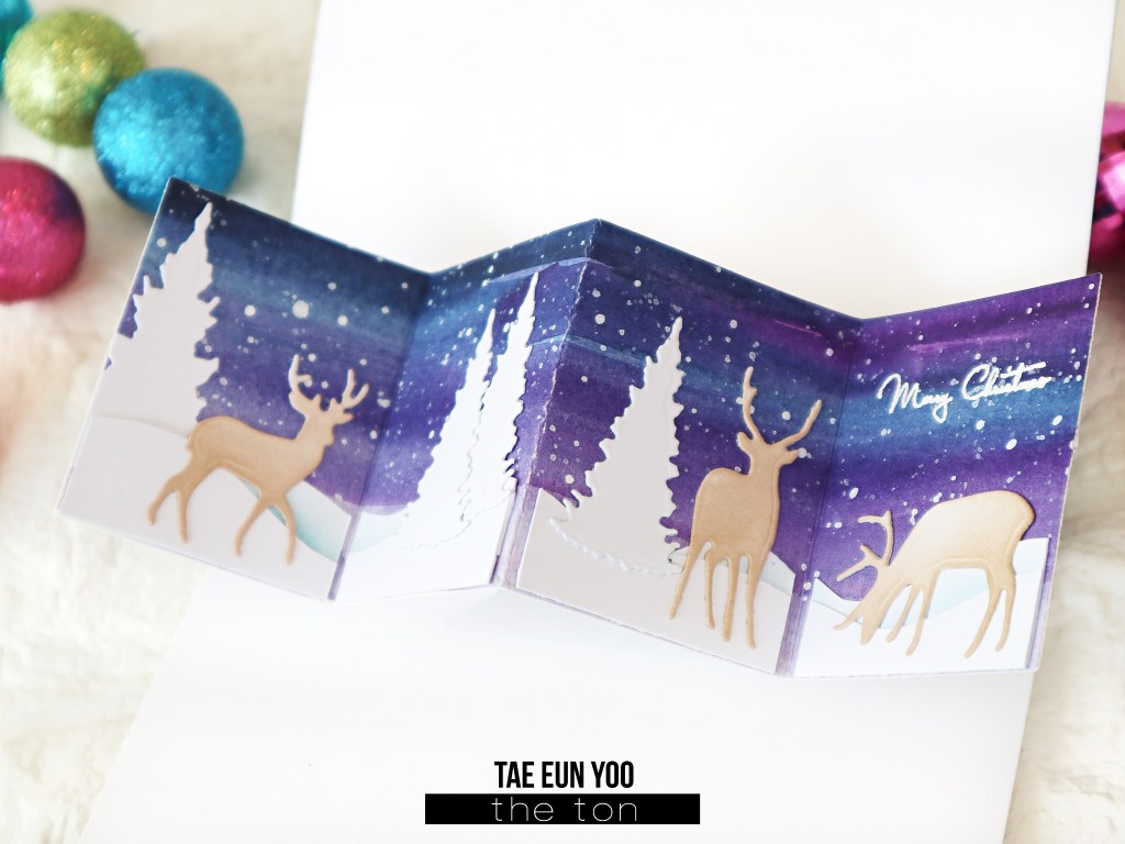 Next I cut a few pine trees and deers from some watercolor paper using Pine Tree Cover die and Deer Cover die. I arranged some pine trees on the snowy hill of my card and added three deers which I watercolored in brown.