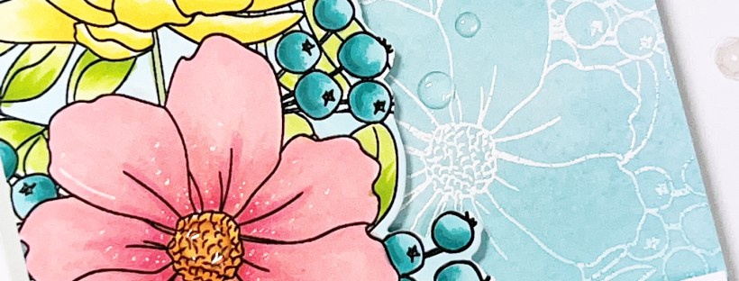 I start by stamping the flower bouquet from Noteworthy Blooms set with Hot Tourmaline. Once this done, I stamped the floral from Heartfelt Blossoms using Soft Ash. Then using Heartfelt Blossoms Layering Stencil set, I colored the flower using Bright Emerald, Iris Blooms and Matcha. For the berries I used Grand Fucshia. Finished with the coloring, I die cut the piece using Heartfelt Blossoms Coordinating dies.