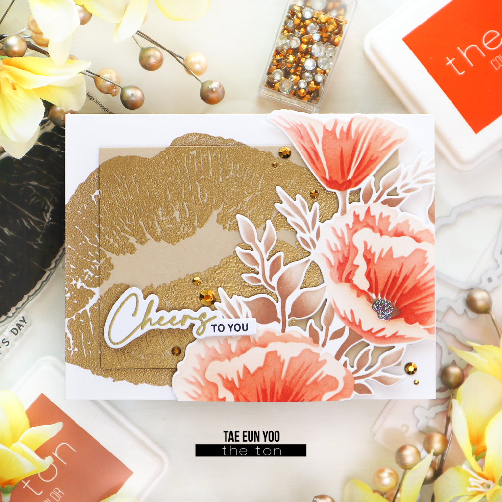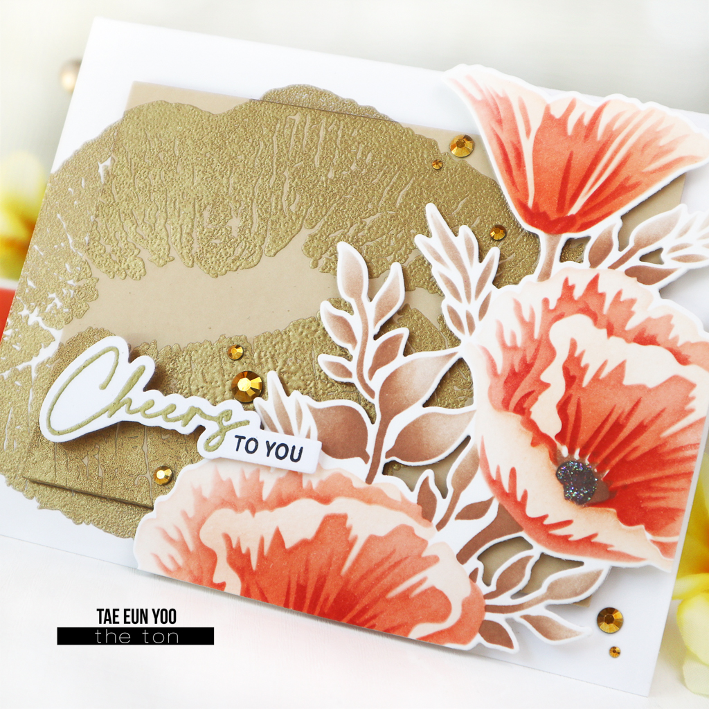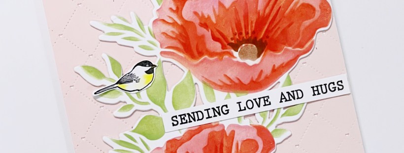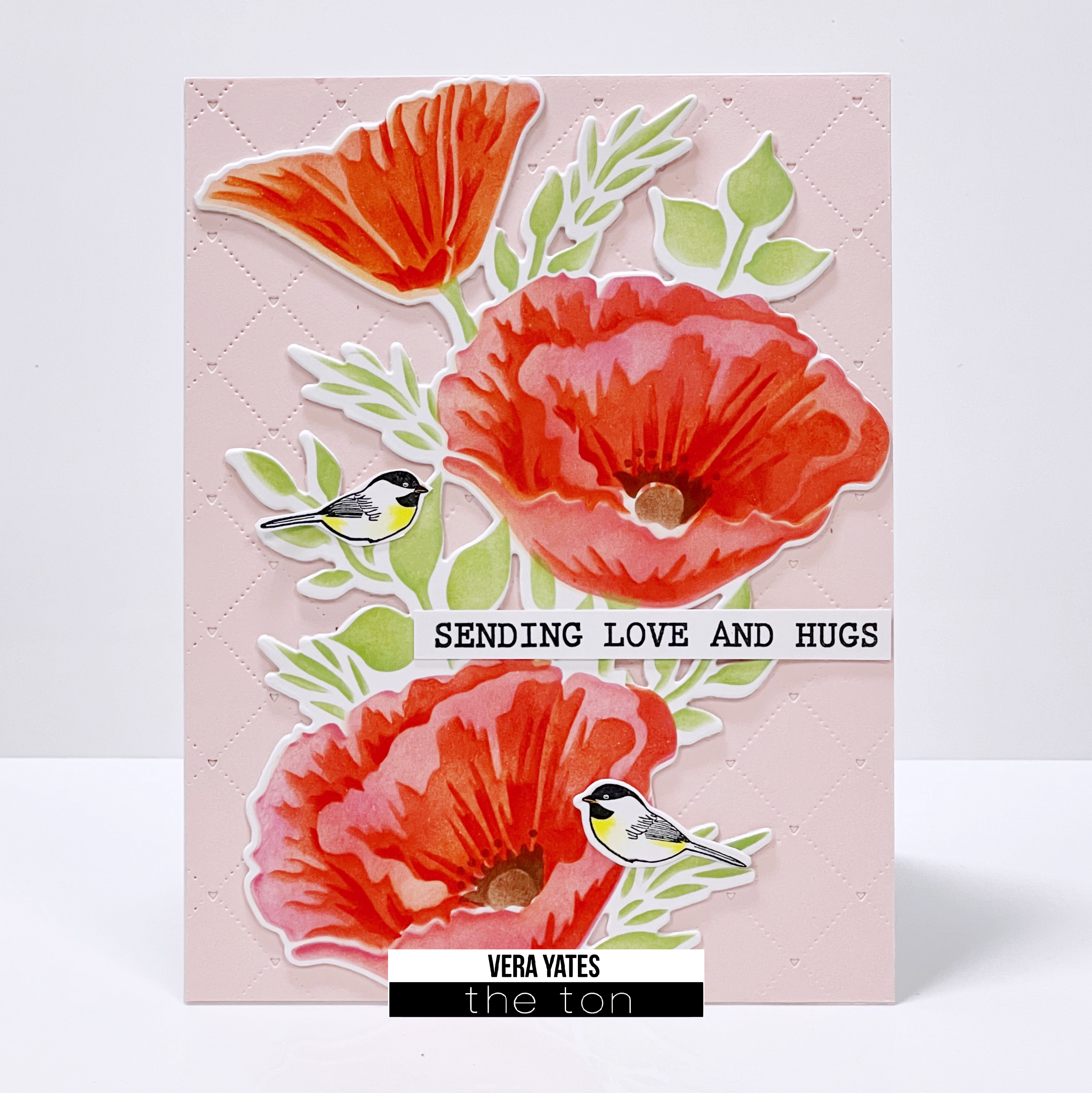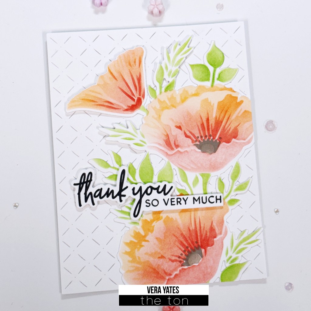Hi friends. Happy Monday. Vera here. Today I want to share a card that’s mixing the old with the new. My card below showcasing the new Diamond Quilted A2 Coverplate & the older set called Precious Poppies Layering Stencil set.