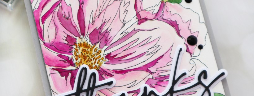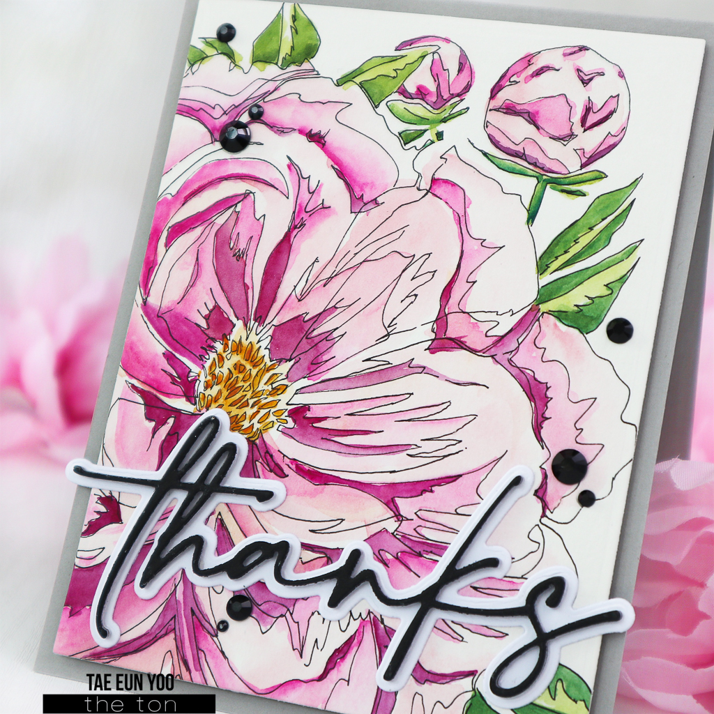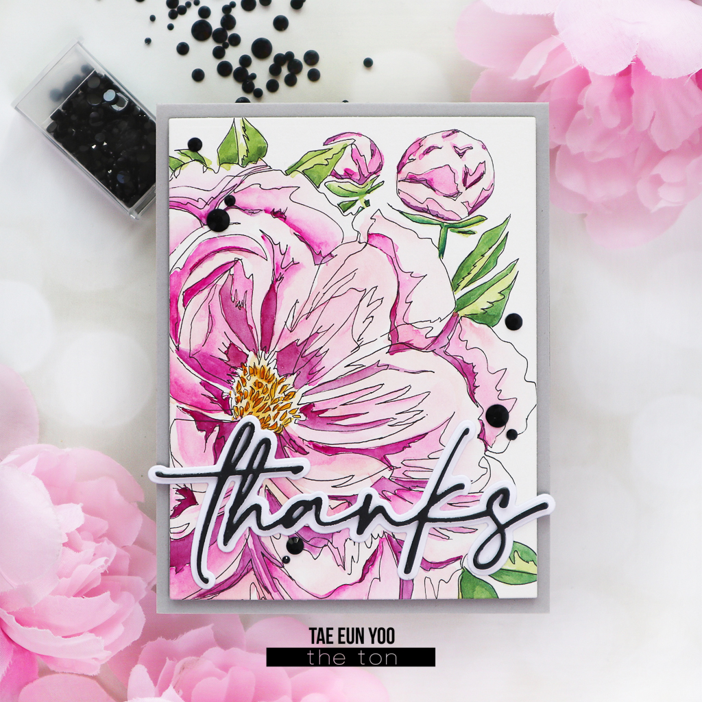 Hello everyone! Hope you’re having a great week so far! It’s TaeEun here today with a thank you card. I watercolored a peony cluster in a sketchy style, which I drew using the Pretty Peony Close Up Layering Stencils. Some time ago, I shared two cards in which I watercolored the main image in layers using layering stencils. For one of them, I stamped the outline using the coordinating stamp set, and for the other one, I drew the outline myself using a black fine liner after watercoloring the images using the layering stencils.