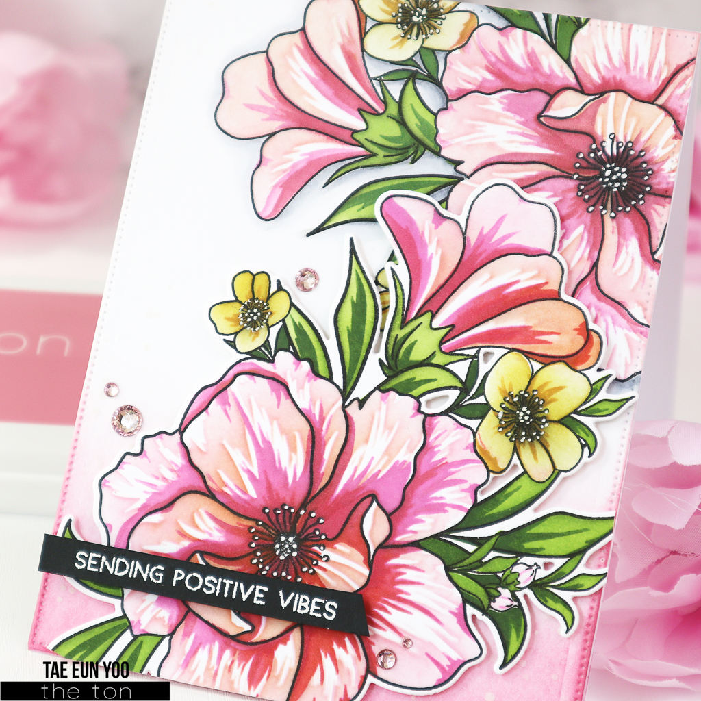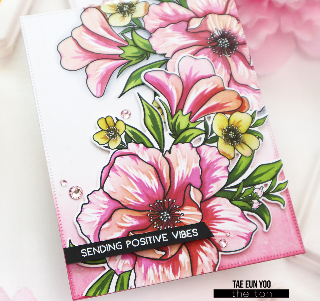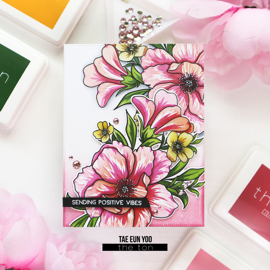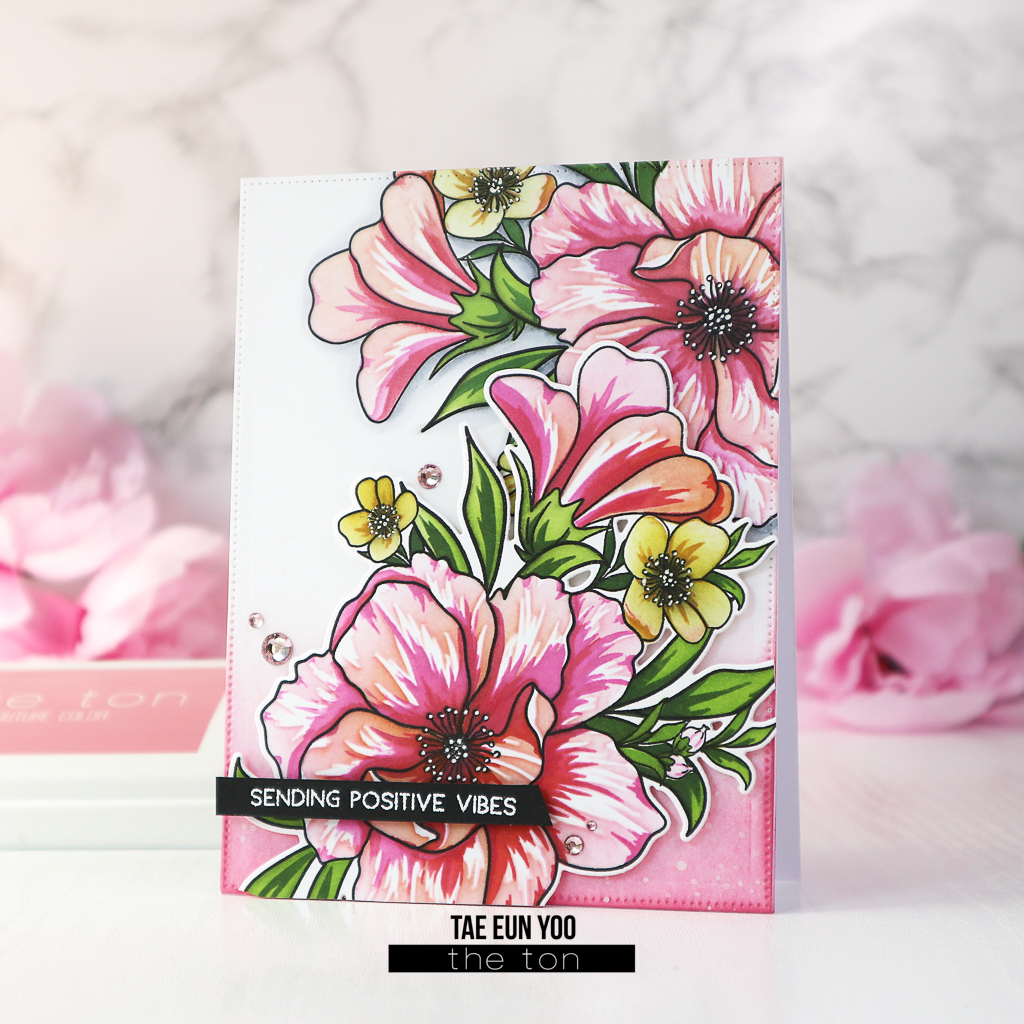 Hello and happy Friday everyone! It’s TaeEun here today with a stenciled floral card. I stenciled the beautiful arrangement of the Sweet Bouquet set in soft colors and placed it on a dark navy cardbase!